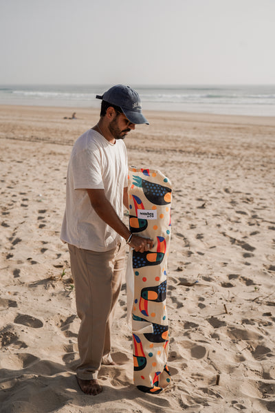O terminal da haste inferior, em parafuso, torna a fixação na areia muito mais fácil, e as hastes em tamanho diferente permitem nivelar a altura conforme o gosto. Para além disso cada guarda sol vem com um saco de alças, de cor a condizer, para pendurar no ombro ou utilizar como mochila.